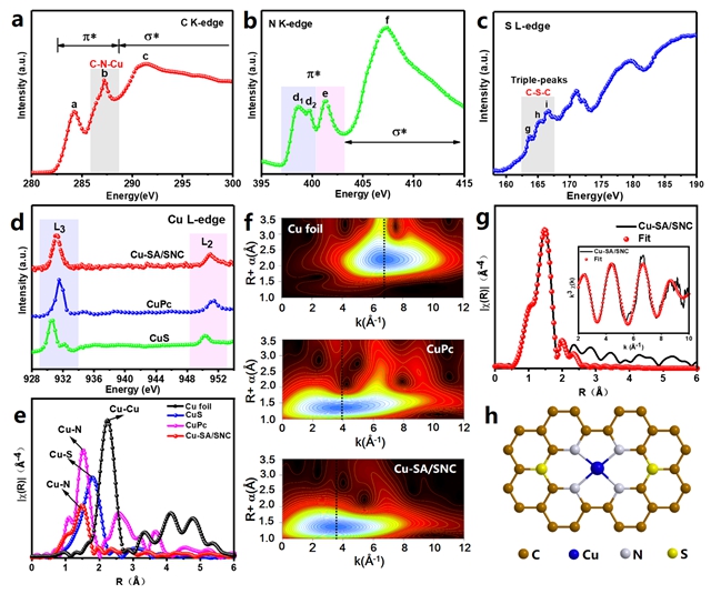 氧還原反應(yīng)(ORR)中催化活性的調(diào)節(jié)對(duì)金屬-空氣電池和其他相關(guān)能量轉(zhuǎn)換材料的開(kāi)發(fā)具有重要意義。金屬嵌入雜原子摻雜碳基催化劑由于其高電導(dǎo)率和可調(diào)節(jié)的電子結(jié)構(gòu),作為有希望的ORR催化劑引起了越來(lái)越多的關(guān)注。納米界面工程由于電荷轉(zhuǎn)移和化學(xué)鍵的強(qiáng)協(xié)同作用,被認(rèn)為是修改碳基復(fù)合材料ORR性能的有效途徑。陳文星等提出了一種原子界面策略來(lái)構(gòu)建顯著提高ORR活性的單原子Cu催化劑,其中Cu原子錨定在硫和氮改性的碳載體(Cu-SA / SNC)上。該催化劑在堿性介質(zhì)中具有優(yōu)異的ORR性能(E1/2= 0.893 V vs. RHE),遠(yuǎn)優(yōu)于同類(lèi)催化劑。此外,基于同步輻射的X射線吸收精細(xì)結(jié)構(gòu)(XAFS)研究以及密度泛函理論(DFT)計(jì)算表明,孤立的鍵長(zhǎng)收縮的低價(jià)Cu (+1)-N4-C8S2原子界面部分為ORR過(guò)程的活性位點(diǎn),原子界面處的Cu和載體產(chǎn)生協(xié)同作用,通過(guò)調(diào)節(jié)中間吸附的反應(yīng)自由能,有效提高ORR效率。該原子界面概念可以為先進(jìn)的氧電極材料的合理設(shè)計(jì)提供新的方法,并為提高其催化性能提供新的可能性。