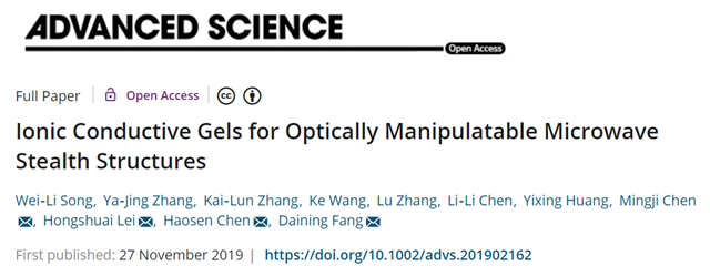 繼2018 年11月17日方岱寧院士研究團隊在著名材料學期刊 《先進功能材料》(Advanced Functional Materials, 2018, 1806383.)報道化學電源系統(tǒng)反向設(shè)計的電化學-力學-光學耦合仿生變色器件之后,11月27日,國際頂級綜合性期刊《尖端科學》 Advanced Science, 2019, 1902162(期刊IF="15.804)在線報道了該研究團隊最新的化學電源系統(tǒng)反向設(shè)計成果:首次基于透明化學電源電解質(zhì)(第二類導體)設(shè)計多層光學可調(diào)電磁隱身結(jié)構(gòu)(Ionic" Conductive Gels for Optically Manipulatable Microwave Stealth Structures)。