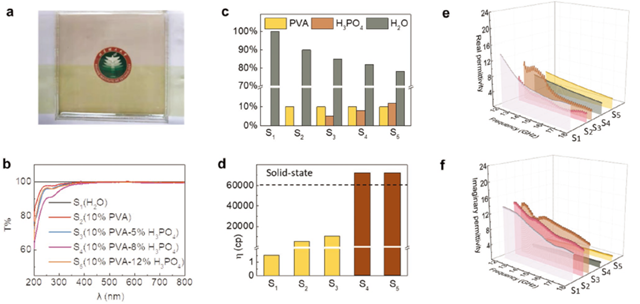 本研究團隊首次基于第二類光學透明導體,離子導體為極化以及損耗介質(zhì),采用水溶性聚乙烯醇作為吸波材料,研究水相聚乙烯醇基凝膠的微波吸收機理表明高極性水分子在介質(zhì)損耗方面對電磁波的衰減起著至關(guān)重要的作用(如圖1所示)。同時,加入具有羥基官能團和磷酸分子的聚乙烯醇聚合物,使水分子以交聯(lián)氫鍵網(wǎng)絡的形式具有一定的流動性。當溫度降低到零度以下時,聚乙烯醇水溶液中的凝膠會變成多晶,從而形成具有散射光波能力的不透明凝膠。這種光學特性因為水溶性聚乙烯醇基凝膠具有溫度依賴的結(jié)晶變換能力而發(fā)生改變。對復介電常數(shù)的研究表明液態(tài)和固態(tài)相的聚乙烯醇基凝膠極性分子對電磁波有不同的敏感度,其中液態(tài)相對于電磁波更加敏感從而產(chǎn)生更多的介電損耗,而半固體凝膠相因為具有更多牢固的氫鍵網(wǎng)絡結(jié)構(gòu),在電磁場中極化程度會被抑制,實現(xiàn)電磁參數(shù)的調(diào)控。