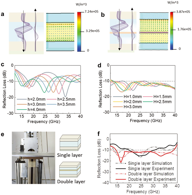 圖2 基于光學可切換透明凝膠的300 X 300 mm2多層結(jié)構(gòu)設(shè)計與弓形法實測:基于最優(yōu)凝膠采用(a)單層凝膠與(b)雙層凝膠設(shè)計多層結(jié)構(gòu)的功率損耗密度分布;(c)采用單層凝膠與(d)采用雙層凝膠的多層隱身結(jié)構(gòu)優(yōu)化;(e)弓形法實測多層透光隱身結(jié)構(gòu);(f) 仿真設(shè)計結(jié)果與弓形法實測結(jié)果對比。