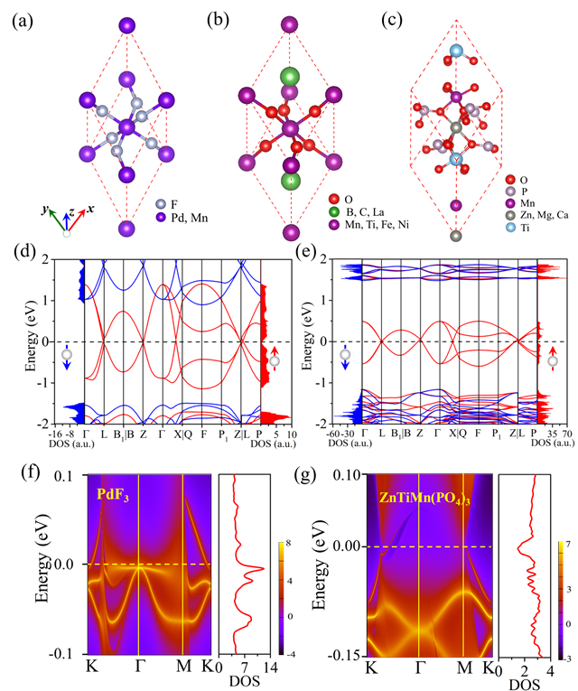 圖2 (a-c)為所預(yù)測(cè)的10種具有 R -3c 和 R 3c 空間群材料。圖(d)和(e)分別為兩種典型候選材料PdF3和ZnTiMn(PO4)3的自旋極化能帶圖和態(tài)密度圖。圖(f)和(g)分別為PdF3和ZnTiMn(PO4)3的[111]面的表面色散和態(tài)密度。