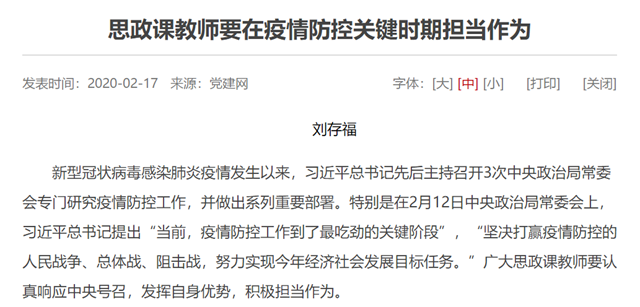 新型冠狀病毒感染肺炎疫情發(fā)生以來(lái),習(xí)近平總書(shū)記先后主持召開(kāi)3次中央政治局常委會(huì)專(zhuān)門(mén)研究疫情防控工作,并做出系列重要部署。特別是在2月12日中央政治局常委會(huì)上,習(xí)近平總書(shū)記提出“當(dāng)前,疫情防控工作到了最吃勁的關(guān)鍵階段”,“堅(jiān)決打贏疫情防控的人民戰(zhàn)爭(zhēng)、總體戰(zhàn)、阻擊戰(zhàn),努力實(shí)現(xiàn)今年經(jīng)濟(jì)社會(huì)發(fā)展目標(biāo)任務(wù)?!睆V大思政課教師要認(rèn)真響應(yīng)中央號(hào)召,發(fā)揮自身優(yōu)勢(shì),積極擔(dān)當(dāng)作為。
