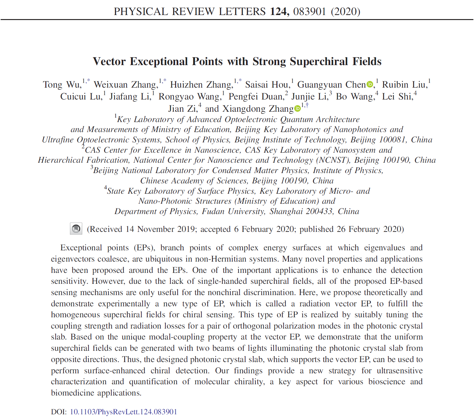 該工作發表于物理學頂級期刊《Physical Review Letters》:Tong Wu#, Weixuan Zhang#, Huizhen Zhang#, Saisai Hou, Guangyuan Chen, Ruibin Liu, Cuicui Lu, Jiafang Li, Rongyao Wang, Pengfei Duan, Junjie Li, Bo Wang, Lei Shi, Jian Zi, and Xiangdong Zhang*,“Vector Exceptional Points with Strong Superchiral Fields”,Physical Review Letters 124, 083901 (2020); 文章鏈接:https://link.aps.org/doi/10.1103/PhysRevLett.124.083901