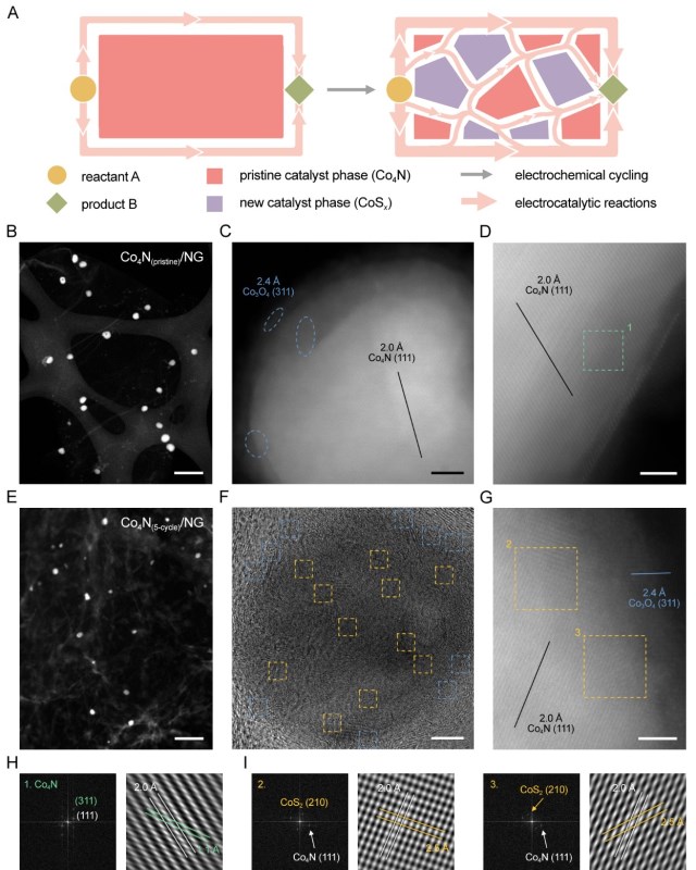 圖1. 預催化劑的原位電化學相演變的示意圖和對應的電子顯微圖像。富金屬化合物作為預催化劑(以Co4N為例)在工作電池中經歷原位“馬賽克化”相演變的過程示意圖。