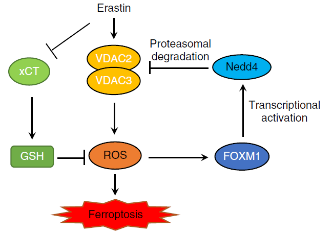 本研究發(fā)現(xiàn)erastin通過(guò)誘導(dǎo)ROS應(yīng)答轉(zhuǎn)錄因子 FOXM1 激活神經(jīng)元前體細(xì)胞表達(dá)發(fā)育下調(diào) 4(Nedd4)的表達(dá)。Nedd4是真核生物 HECT 結(jié)構(gòu)域 E3 連接酶家族的重要成員,在進(jìn)化過(guò)程中保持保守性。Nedd4 通過(guò)其WW結(jié)構(gòu)域與VDAC2/3的PPxY序列結(jié)合并促進(jìn)VDAC2/3降解,從而降低了癌細(xì)胞對(duì) erastin 的敏感性。通過(guò)抑制Nedd4和FOXM1的表達(dá),以減少VDAC2/3蛋白質(zhì)降解的方法,可以增加癌細(xì)胞對(duì)erastin的敏感性。該項(xiàng)研究闡明了一種基于FOXM1-Nedd4-VDAC2/3負(fù)反饋回路,揭示了腫瘤細(xì)胞如何適應(yīng)新的小分子藥物并維持細(xì)胞內(nèi)穩(wěn)態(tài)的分子機(jī)制,并提示了以Nedd4作為靶標(biāo)治療,通過(guò)細(xì)胞鐵死亡治療腫瘤的新思路。