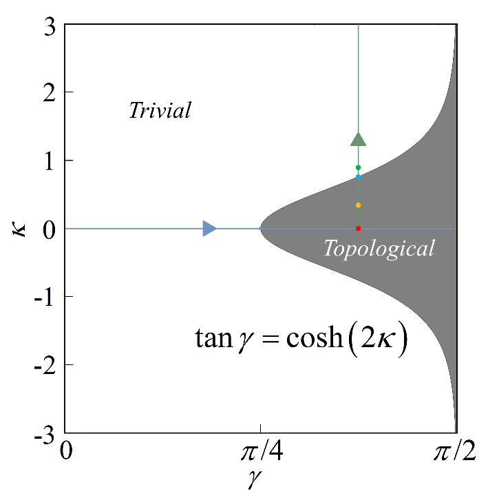圖 由耦合強度γ和增益損耗量κ決定的二維拓撲相圖。拓撲相界面由數學關系tanγ=cosh(2κ)描述。