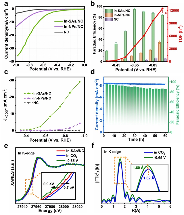 圖3 In單原子電催化CO2RR選擇性制備甲酸鹽性能測試