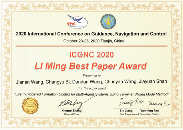 國際制導、導航與控制學術會議(ICGNC)是目前中國最大的航空、航天、航海、陸地等運動體制導、導航與控制(GNC)領域的國際學術會議,每兩年舉辦一次,已經成功舉辦8屆。本屆會議于10月23日至25日在天津舉行,邀請了包為民院士、陳志杰院士和蘇東林院士分別作制導、導航與控制相關的大會報告。會議共收到811篇論文,經過嚴格評審最終共616篇文章被收錄。李明最佳論文獎是2014年由中國工程院院士李明出資設立,旨在獎勵45歲以下的優秀青年科技工作者,鼓勵國內外更多的青年人投身于制導、導航與控制的前沿性學術研究和關鍵性技術創新,每屆不超過1名,截止2020年,共7人獲獎。