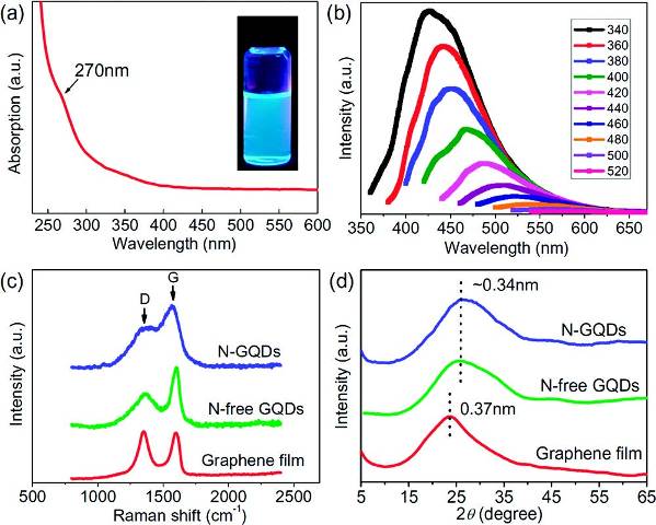 曲良體教授科研團隊建立了一個簡單的電化學方法實現了含富氧功能基團的氮摻雜石墨烯量子點的制備,它同時具備熒光和電催化氧還原反應的活性。與未摻雜狀態相比,新的石墨烯量子點氮/碳原子比約為4.3%,可以激發出藍色熒光,而且在堿性介質中具備可與市售Pt/C催化劑相比擬的氧化還原催化活性。這一研究通過實現了氮摻雜對量子點光電學性質的調控,同時也開拓了其在氧化還原催化劑方面的應用。這些特性使其可以作為燃料電池中的催化劑,以及應用于生物醫學成像領域。