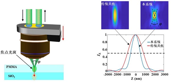(a) 斜向激發與收集光路 (b) 壓縮了散射體軸向尺寸