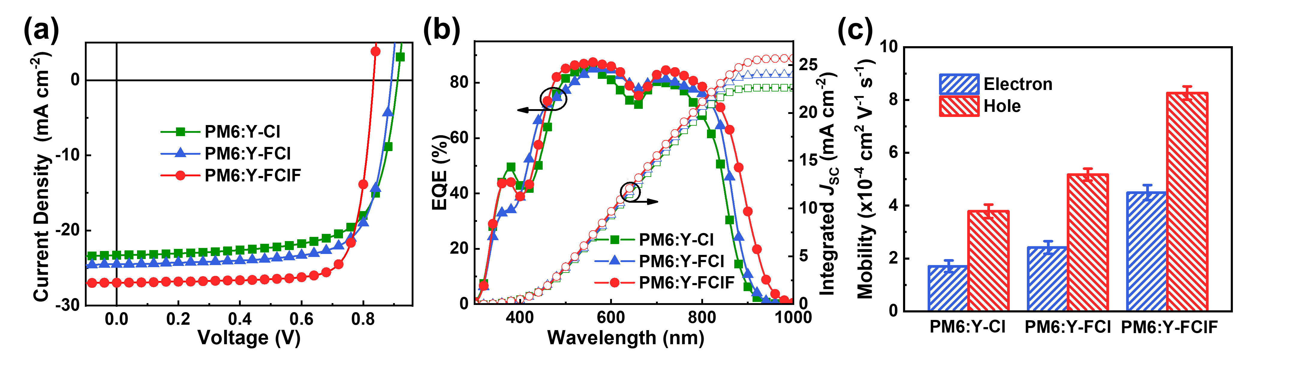 該團隊首次獲得了基于區域規整的雜二鹵化/雜三鹵化端基受體Y-FCl和Y-FClF的單晶結構。晶體學分析和密度泛函理論(DFT)計算表明,與Y-FCl相比,隨著氟取代個數的增加,Y-FClF相鄰分子之間不僅保持了原有的晶系,而且表現出更好的分子平面性,更短的π?π堆疊距離和更顯著的π?π電子耦合和更有序的三維分子堆積網絡,從而提升其薄膜態的多個方向上的電荷傳輸能力。此外,PM6:Y-FClF共混膜在分子堆積上表現出最有序和最顯著的face-on分子堆積取向,在合適的相分離下表現出最強的結晶傾向,并且在三種共混膜中具有最高和最平衡的電荷遷移率。因此,基于PM6:Y-FClF的有機太陽能電池實現了17.65%的光電轉換效率,明顯高于基于PM6:Y-FCl(16.00%)和PM6:Y-Cl(14.47%)的電池效率。更重要的是,該效率是基于雜鹵化小分子受體的二元有機太陽能電池中的最高效率之一。