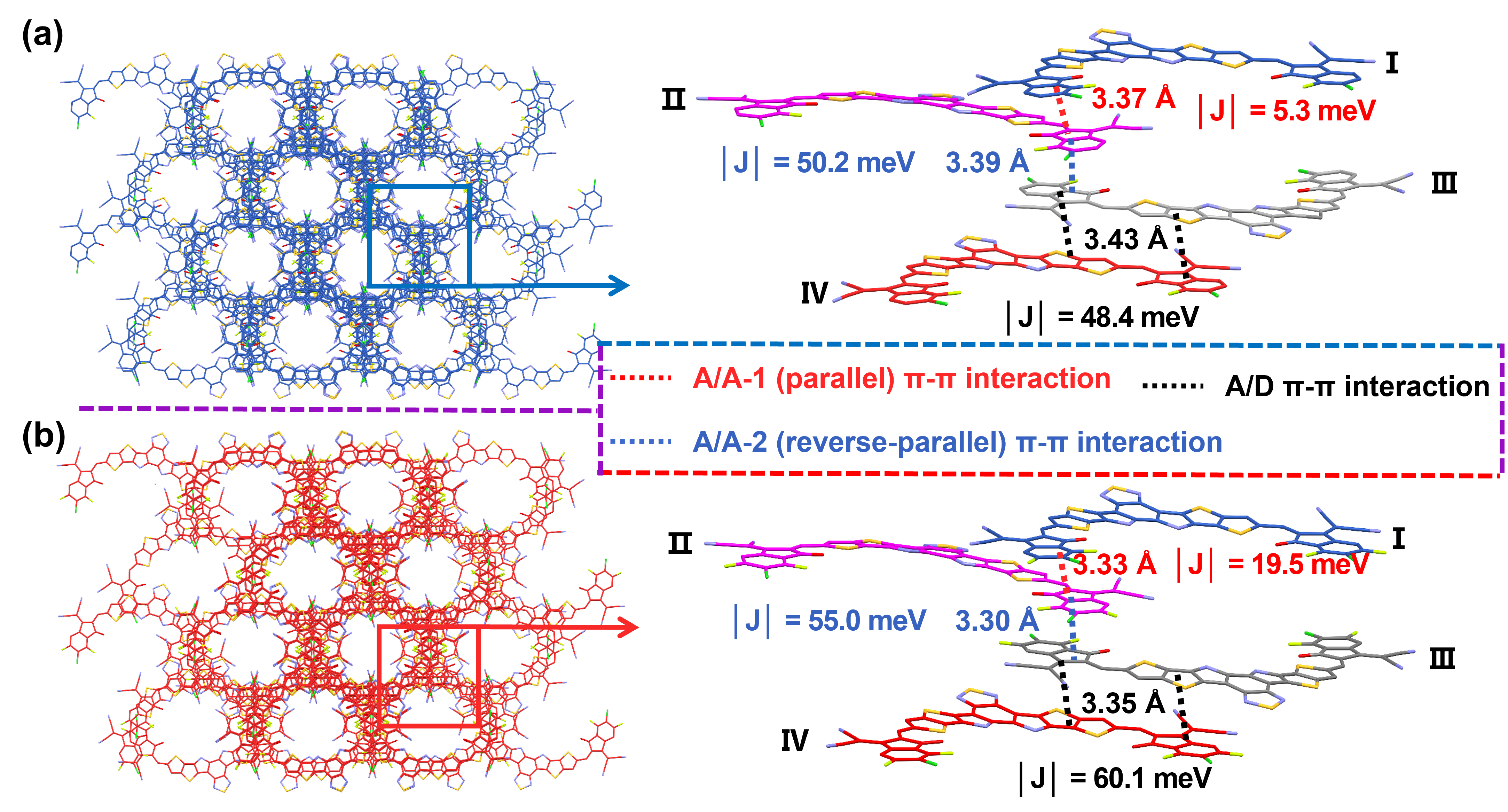 圖2. Y-FCl (a)和Y-FClF(b)單晶的三維堆積模式與π-π相互作用信息