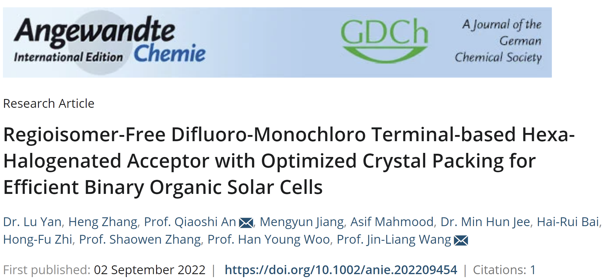 近期,北京理工大學王金亮教授團隊在構筑基于區域規整異三鹵化端基的高效率有機太陽能電池受體材料方面取得重要進展,相關研究成果發表在國際化學領域頂級期刊《Angewandte Chemie International Edition》上,題為“Regioisomer-Free Difluoro-Monochloro Terminal-based Hexa-Halogenated Acceptor with Optimized Crystal Packing for Efficient Binary Organic Solar Cells”。北京理工大學為唯一作者通訊單位,化學與化工學院王金亮教授與安橋石特別研究員為該論文的通訊作者,碩士研究生閆祿和博士研究生張恒為論文的共同第一作者。