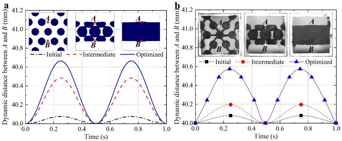 圖2 介電彈性體軟作動器電極拓撲優化:(a) 計算結果; (b) 實驗結果
