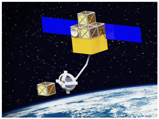 空間碎片問題日益嚴峻,如何安全地開展碎片消旋與捕獲是研究難點與熱點。采用空間繩網和機械臂捕獲碎片是目前較為可行的捕獲方法(圖5)。針對空間繩網捕獲法,團隊成員單明賀助理教授等基于多柔體動力學絕對節點坐標法構建了“服務航天器-繩網-目標”的組合體系統動力學新模型,通過實驗和計算相結合的研究思路,預測了系統的捕獲動特性。對此類欠驅動系統,單明賀等還提出了基于系繩拉力的目標消旋控制算法,構建了末端執行器與目標的接觸動力學模型,采用混合力位控制方法成功對目標碎片進行消旋。相關論文已發表于《Aerospace》(M. Shan, L. Shi. 9: 33, 2022),《Acta Astronautica》(L. Shi, X. Xiao, M. Shan* et al. 193: 469-482, 2022)。研究成果已經被我國航天部門應用于繩網捕獲系統的設計。在多柔體動力學建模研究方面,團隊成員韓石磊副教授基于對偶四元數、變域哈密頓變分原理提出了系列可用于多柔體動力學分析的新有限單元,可實現系統高效建模和計算,研究成果發表于計算力學頂級期刊《Computer Methods in Applied Mechanics and Engineering》(S. Han. 395: 115063, 2022),獲同行專家高度評價。此外,團隊博士生王帥等提出了基于立方形星群組裝的空間碎片清除與防護技術方案,獲得了世界大學生立方星挑戰賽中國區總決賽特等獎(圖6)。