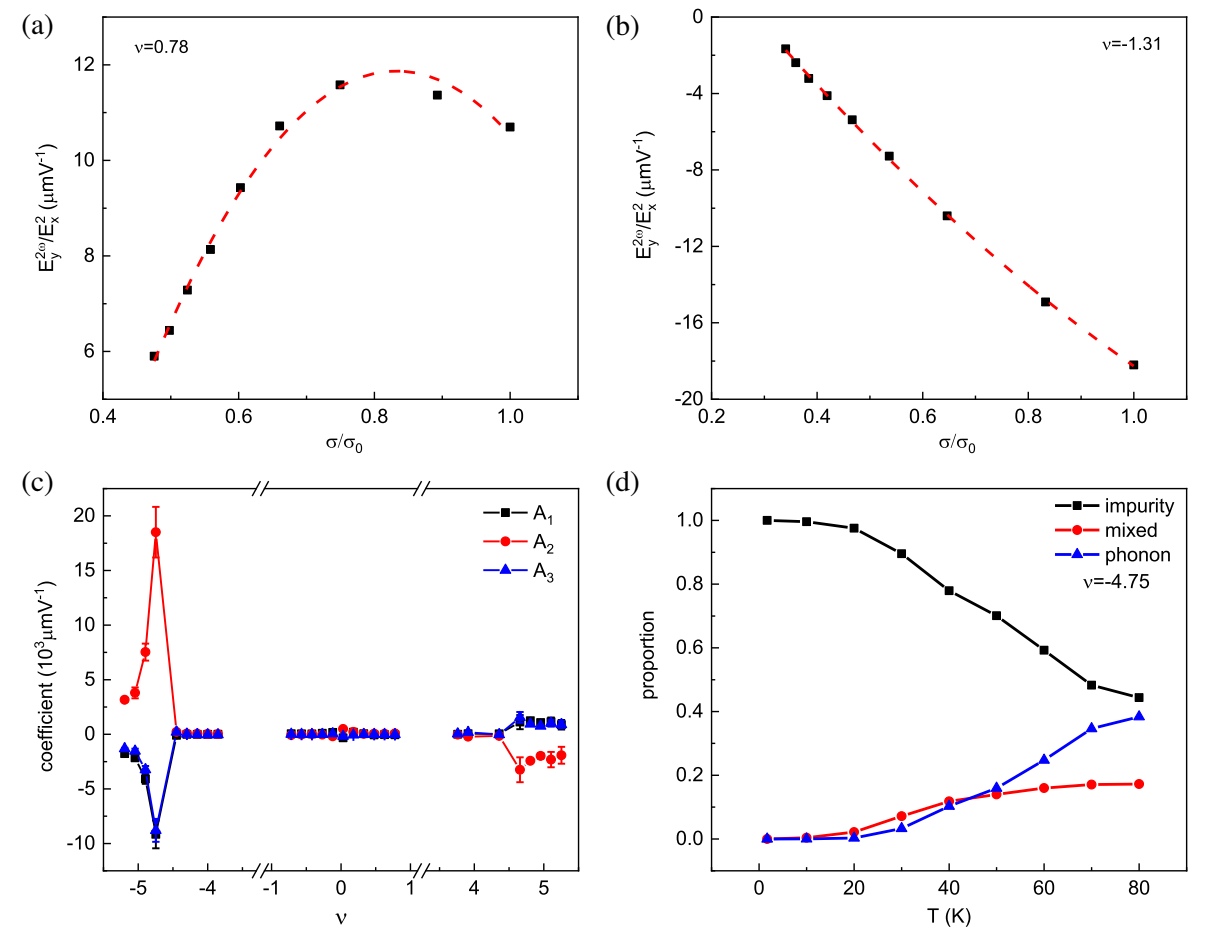 該研究工作有以下兩個亮點:(1). 研究團隊首次在轉角石墨烯體系中觀測到了巨非線性霍爾效應。獲得的非線性霍爾電導比之前報道的WTe2以及轉角WSe2等體系中的觀測值至少大兩個量級,如圖1所示。(2). 通過標度分析,研究團隊首次嚴格區分了散射機制中不同散射源的貢獻。不同于之前研究中只討論了雜質引起的skew scattering,該工作首次觀測到了聲子引起的skew scattering貢獻,并揭示了聲子的貢獻隨著溫度上升可以與雜質貢獻相當,如圖2所示。