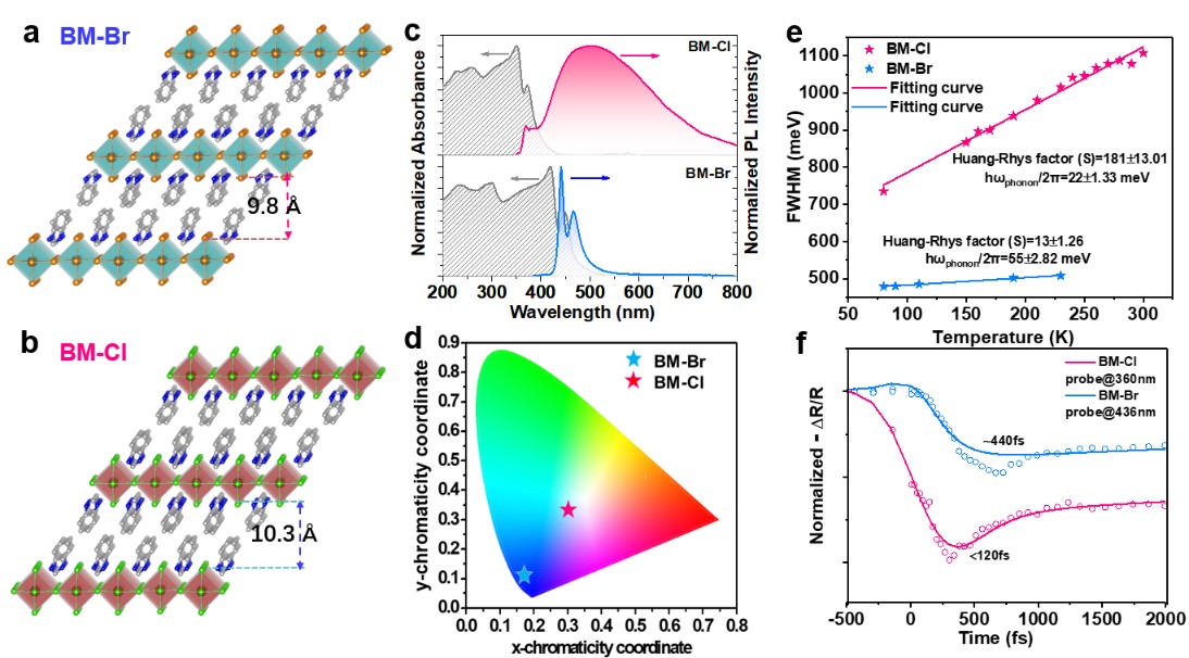 圖2 BM-Cl和BM-Br的晶體結(jié)構(gòu)以及光學(xué)特性譜圖(光致熒光PL、色域值、Huang?Rhys因子計(jì)算和瞬態(tài)熱激子弛豫)
