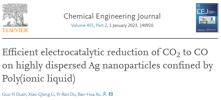 近日,北京理工大學徐寶華教授團隊在構筑聚離子液體-銀(PIL-Ag)雜化材料用于高效電催化二氧化碳(CO2)制一氧化碳(CO)方面取得重要進展,相關研究成果發表在國際化學工程領域頂級期刊《Chemical Engineering Journal》上,題為“Efficient electrocatalytic reduction of CO2 to CO on highly dispersed Ag nanoparticles confined by Poly(ionic liquid)”。北京理工大學為唯一作者通訊單位,化學與化工學院徐寶華教授為該論文的通訊作者,段國義預聘助理教授為該論文的第一作者。