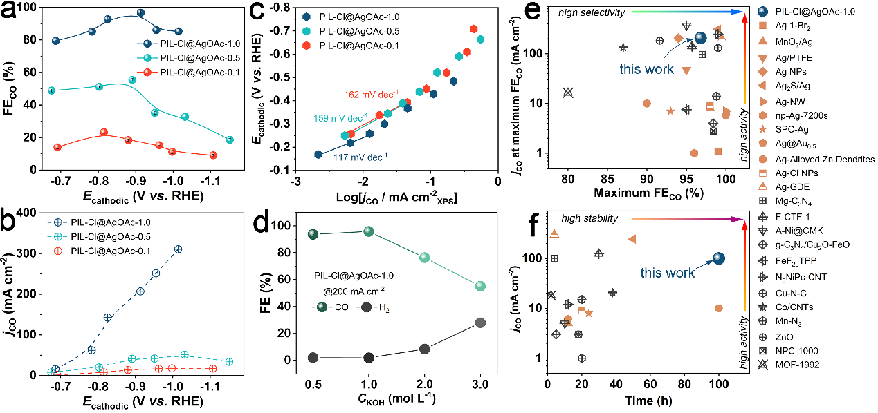 在前期工作中,徐寶華教授團隊構筑了系列PIL-單金屬/雙金屬雜化材料,實現了大電流密度、高選擇性、高穩定性的電催化CO2/CO至C2+產物轉化,揭示了PIL-金屬界面性質對反應路徑的調控以及PIL對金屬高度分散的作用( Angew. Chem. Int. Ed. , 2022, 61: e202110657; Appl. Catal. B. Environ. , 2021, 297: 12047; Appl. Catal. B: Environ. , 2022, 313: 121459; Chem. Eng. J.,  2023 , 451: 138491;  Fundamental Research , 2022, 2: 937)。在本工作中,通過簡單浸漬法在PIL中引入Ag鹽,合成了系列PIL-Ag雜化材料。PIL對于原位生成的高分散Ag–Cl物種具有顯著的限域效應。PIL中陽離子骨架結構與Ag鹽種類直接影響Ag(I)絡合物、Ag–Cl簇和Ag–Cl納米粒子的形成與演化。得益于PIL中高度分散的咪唑-吡啶-咪唑三齒螯合位點與適當的Ag+供給速率,制備了最優的PIL-Cl@AgOAc-1.0雜化材料。在1 M KOH溶液中,–0.91 V(相對可逆氫電極)電位下,實現了96.8%的高CO法拉第效率與207.0 mA cm–2的偏電流密度。此外,該催化劑在100 mA cm–2下持續電解100小時依然保持較高的CO法拉第效率(~86%),體現了優秀的催化穩定性。機理研究表明,盡管三種Ag–Cl物種具有相似的內在活性,但Ag–Cl物種的分散形式、活性位點的數量以及反應物的傳質共同決定了高反應速率下表現出的表觀電催化性能。