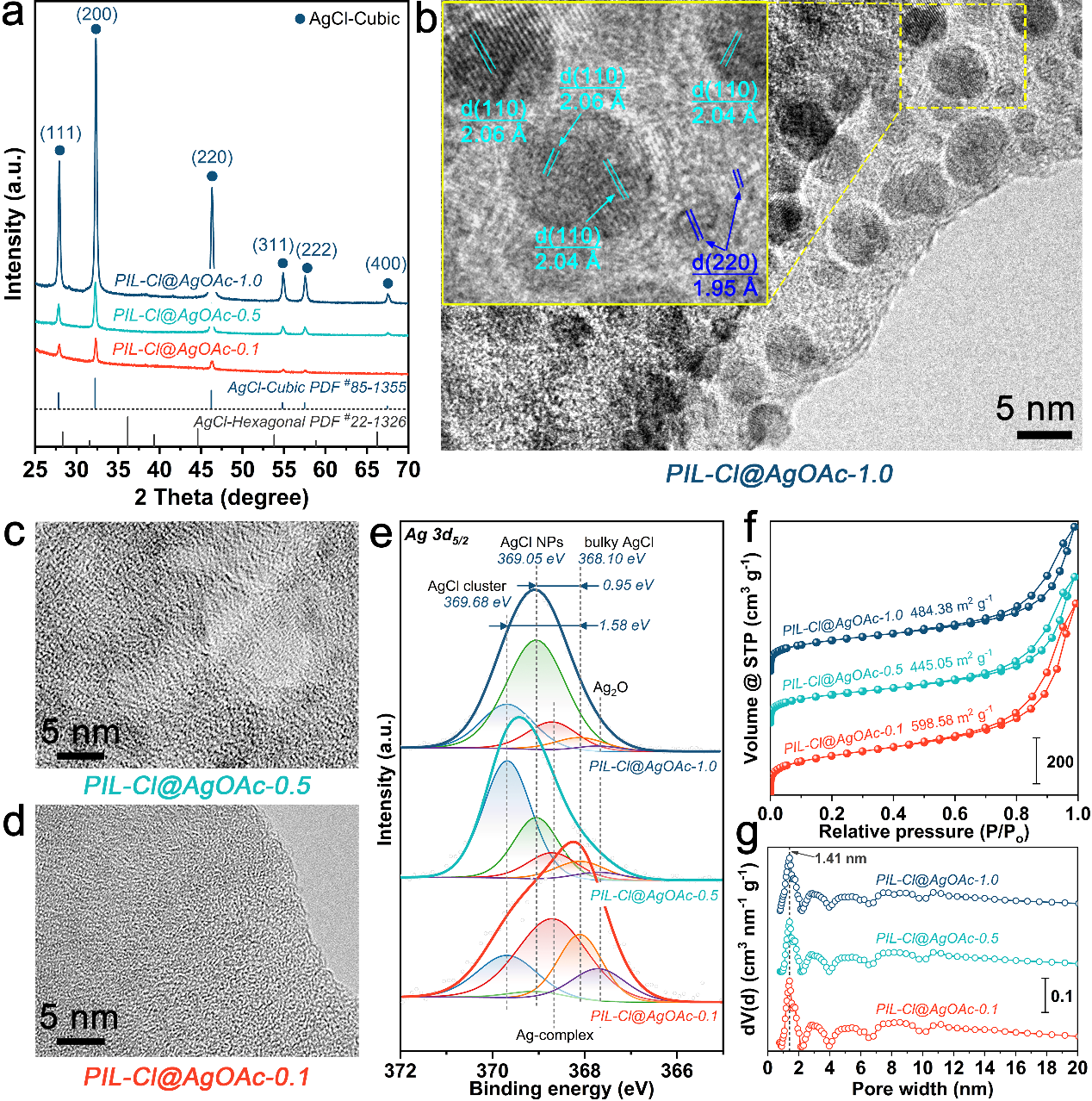 結構表征表明Ag的浸漬量影響Ag–Cl物種的存在形式:小浸漬量時以Ag(I)絡合物為主,中等浸漬量時以Ag–Cl簇為主,大浸漬量時則以Ag–Cl納米顆粒為主。TEM結合XRD揭示了Ag–Cl納米顆粒為罕見的六方晶相AgCl,表明PIL骨架結構對Ag–Cl納米顆粒的形成具有限域效應。