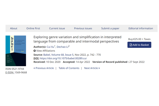 近日,北京理工大學外國語學院助理教授徐翠博士在國際頂級翻譯學期刊Bab...