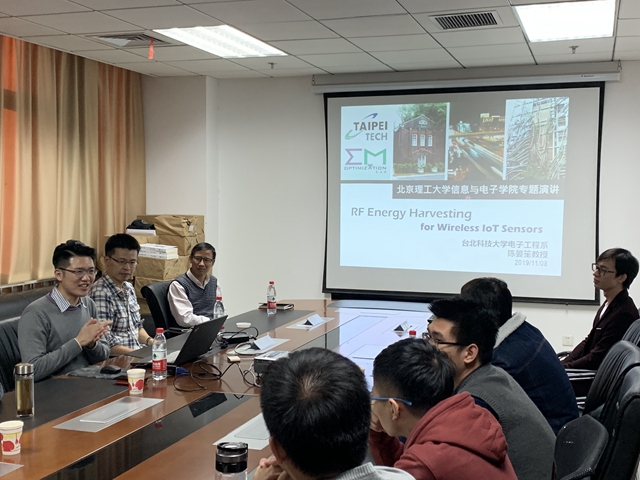11月8日下午,北京理工大學(xué)信息與電子學(xué)院聯(lián)合研究生院邀請臺北科技大學(xué)電子工程系陳晏笙(Yen-Sheng Chen)教授、曾柏軒(Po-Hsuan Tseng)教授來校進(jìn)行學(xué)術(shù)交流。陳晏笙教授應(yīng)邀做了題為“RF Energy Harvesting for Wireless IoT Sensors”的“21世紀(jì)學(xué)科前沿”系列學(xué)術(shù)報告。出席此次會議的有信息與電子學(xué)院王華教授等十余名教師、博士研究生和碩士研究生。
