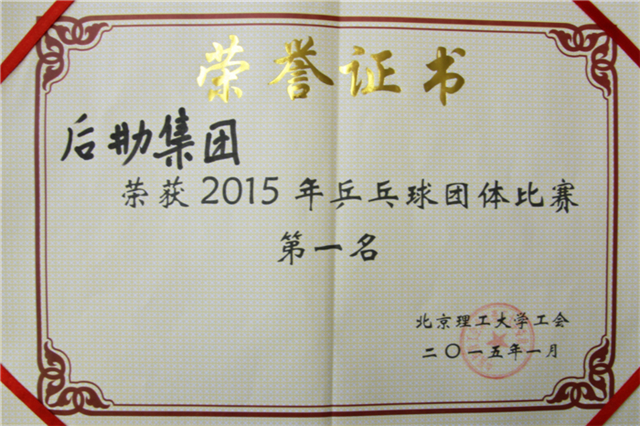 2015年1月20日下午,北京理工大學2014年教職工乒乓球比賽在學校體育館拉開帷幕。來自后勤集團的陳洋、李鋒博、高建立、王艷、陳健、逯貴順、王京、麥穗琴組成后勤集團代表隊,以全勝的戰績成功晉級八強;21日下午,后勤代表隊堅持不懈,一路過關斬將,最終登頂成功,獲得校工會乒乓球團體賽第一名。