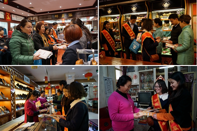 “送法進企業、送法進家庭”,志愿者們跟隨大柵欄街道的工作人員走進天福茗茶、步瀛齋和祥義號等老字號企業,在感受大柵欄街道老字號企業文化的同時,為企業發放了3•15普法宣傳手冊,并與企業員工探討有關消費者權益保護的熱點問題。