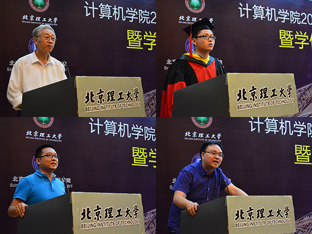 隨后,姜子恒同學作為2015屆畢業生代表發言。從第一次實驗室組會到無數次通宵趕論文的經歷,再到豐富多彩的課余生活,姜子恒回顧了自己科研道路上的點點滴滴,表達了對父母、對母校、對老師、對同學的感恩之情。回首艱苦的科研生活,姜子恒認為正是當初的那份“苦”,讓我們品嘗到了現在的這份“甜”,并鼓勵大家要永葆夢想、自信前行。導師們對于畢業生們的期許和不舍,畢業生們對于母校師長的拳拳感恩之情,已融入這感人肺腑的字里行間,引得臺下老師和同學們無不動容。相信在北理工計算機學院求學的歲月,將會成為畢業生們人生道路上最靚麗與最難忘的一道風景線。