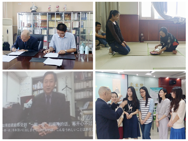 友愛協會的羽中田女士用從日本空運來的榻榻米,橫幅和各種茶具搭建了茶室—無境庵,為同學們演示了正統的茶道,并請大家品嘗了精致的抹茶和茶點。同行的兩位日本大學生川手祥右和高橋佳大也分別就日本的傳統建筑和學生就業做了精彩的報告。友愛協會理事長,日本前首相鳩山由紀夫還特意通過視頻為理工大日語系學生送來問候。