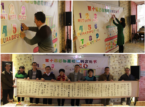 文藝表演之后,八校師生共同完成了閉幕式藝術作品。參加閉幕式的各高校同學們完成了代表首都高校材料文化節十周歲的生日蛋糕,八校嘉賓將代表主辦屆別和學校的貼紙貼入作品中,共同表達了美好的祝愿,希望首都高校材料事業像七彩蛋糕一樣絢爛多彩。