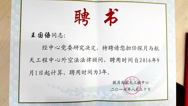 2016年9月18日,國防科工局探月航天工程中心(中心)聘請法學院王國語副教授為外空法法律顧問,王國語應邀參加了中心的聘用儀式。