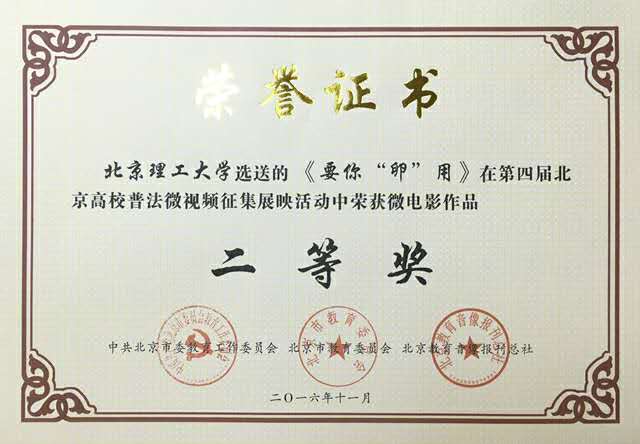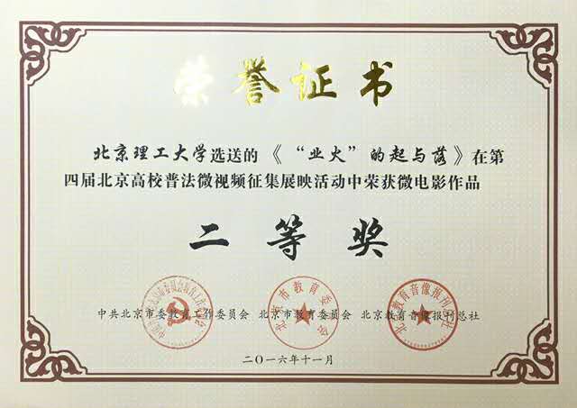 日前,由北京市委教育工委、市教委主辦的第四屆北京高校普法微視頻征集展映活動的結果揭曉,由北京理工大學選送的《“業火”的起與落》、《要你“卵”用》榮獲二等獎,同時北京理工大學獲得優秀組織獎。