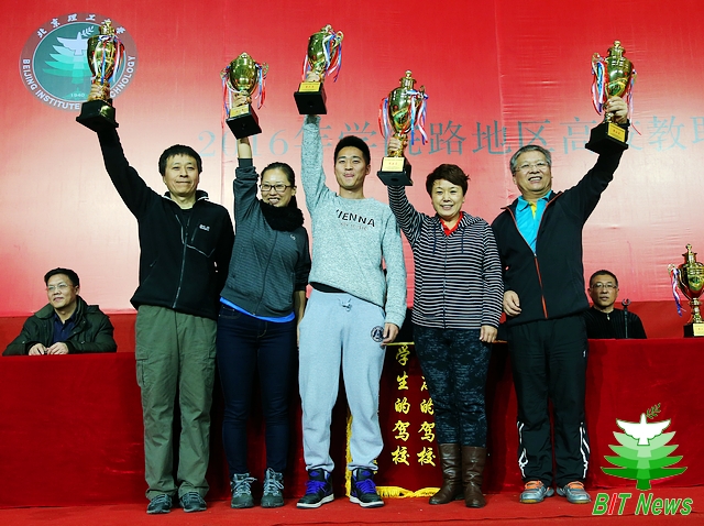 頒獎(jiǎng)儀式上,裁判長、我校體育部副主任孟光云宣布比賽結(jié)果。參賽高校工會(huì)負(fù)責(zé)人徐英克、王翔、關(guān)進(jìn)平、賈水庫、張海濤、尹志強(qiáng)和海淀駕校副校長徐小靈等領(lǐng)導(dǎo)為獲得前八名的代表隊(duì)頒發(fā)了獎(jiǎng)杯,并合影留念。頒獎(jiǎng)儀式由劉明奇主持。