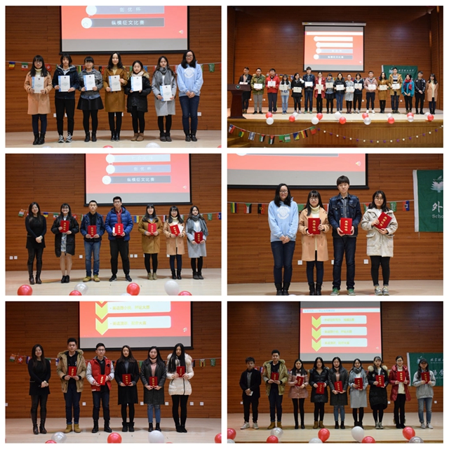 下篇以“超越自我”為主題,表彰在專業外發展突出的同學。2016年,外國語學院在校級“世紀杯”評選中張乃文團隊榮獲一等獎,林一南團隊等五個團隊榮獲三等獎,院級“創優杯”也評選出多個優秀團隊。在校團委指導下舉辦的“縱橫”征文比賽中,張乃文、李燕、檀林耀分別獲得最佳視角作品、最佳原創作品、最佳青年評論員稱號。寒暑假社會實踐中,十余個團隊表現優異。由現場教師代表為獲獎學生頒獎。