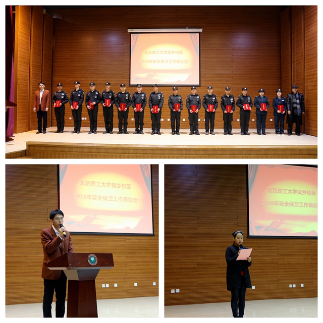 為加強良鄉(xiāng)校區(qū)安全保衛(wèi)工作,樹立典型、表彰先進,良鄉(xiāng)校區(qū)2016年度安全保衛(wèi)工作表彰大會于2017年1月17日舉行。北京理工大學良鄉(xiāng)校區(qū)管理處處長朱光輝、副處長霍俊斌、副處長張磊,北京時代科安保安服務總公司董事長張傳橋、北京國基偉業(yè)物業(yè)管理有限公司董事長李笑天出席表彰會,校區(qū)全體保安員、師生代表共120余人參加表彰會。