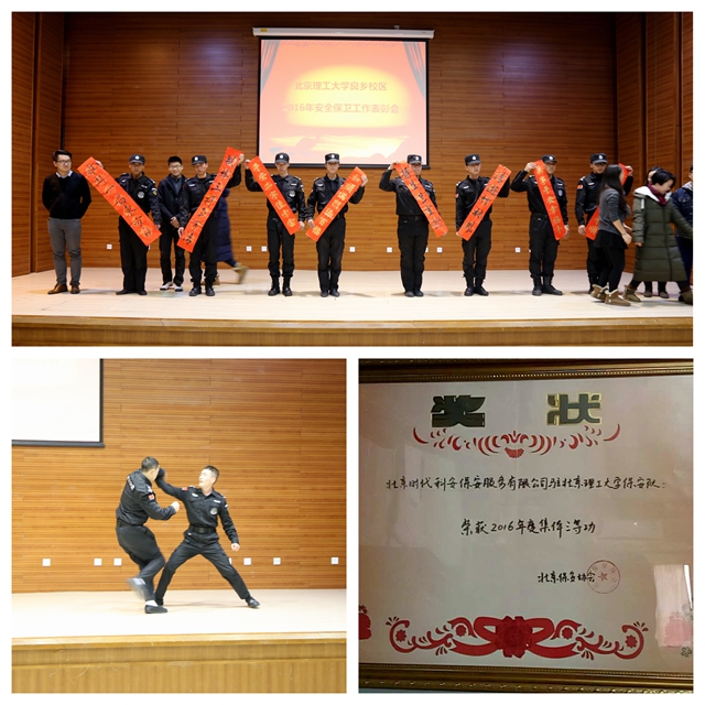 2016年,良鄉(xiāng)校區(qū)安全穩(wěn)定工作實現(xiàn)全年無重大治安刑事案件、群體事件、火災火險、汛期災害及交通事故,切實實現(xiàn)“平安校園”,因此,北京時代科安保安服務總公司駐北京理工大學保安隊榮獲由北京市保安協(xié)會頒發(fā)的2016年度“集體三等功”。2017年,良鄉(xiāng)校區(qū)管理處及保安隊將繼續(xù)在學校黨委的領導下,以“雙一流”建設為目標,進一步加強安全保衛(wèi)工作,為校區(qū)師生提供安全、滿意服務,建設“平安,和諧”校園。