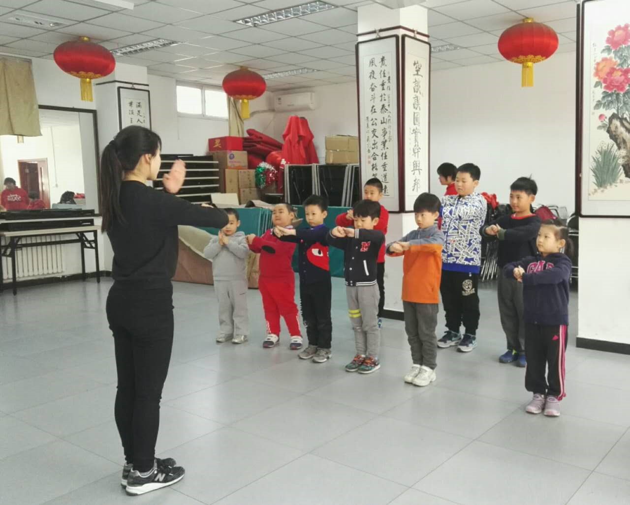 鑒于小朋友大多沒有武術基礎,倪老師就從簡單的武術手型手法、腿型腿法開始教起。武術的手法練習運用拳、掌、勾三種手型,結合沖、架、推、亮等運動方法,簡單易學,特別適合入門級別的小朋友學習。“沖拳”、“架拳”、“推掌”、“亮掌”,雖然這些專業名詞難以記憶,但是小朋友們在動作上毫不馬虎,一招一式都學得有模有樣,時時得到倪老師的夸贊。小朋友對武術的積極熱情與倪老師生動有趣的教學,讓整個課堂在歡樂的氛圍中度過。