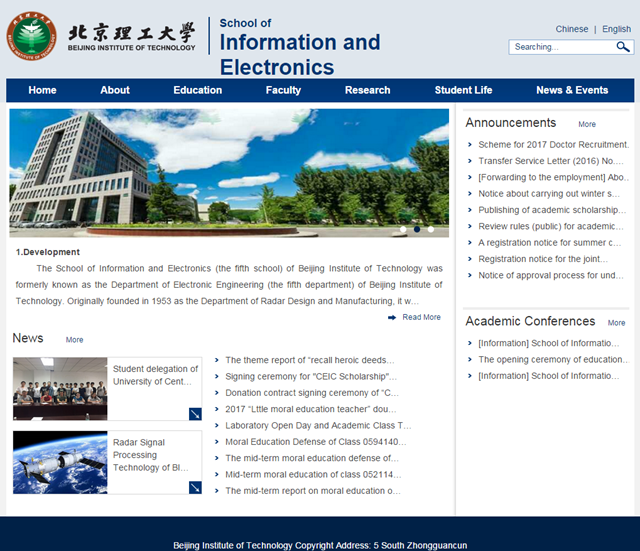 2016年下半年,信息與電子學院積極開展學院英文網站籌建工作,安排專人積極與宣傳部對接,選定網站模板,確定網站目錄,向宣傳部提供了本學院的英文網站欄目設置意向共7個一級欄目、16個二級欄目,并提供學院中文簡介內容百余篇,包括學院概況、人才培養(yǎng)、師資水平、科學研究、學生生活、新聞動態(tài)等7個板塊信息,立體化展示了學院辦學特色和水平。在充分溝通的基礎上,經學院審核后,信息與電子學院英文網站于2017年5月中旬完成了全部建站內容,正式上線。