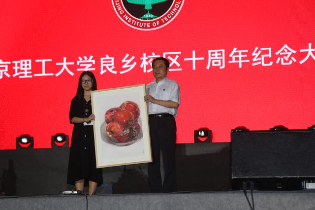 北京理工大學校長、中國科學院院士胡海巖代表學校接受了在校生代表,設計與藝術學院高楚同學為良鄉校區十周年創作的藝術作品,并宣布北京理工大學良鄉校區十周年紀念活動開幕!