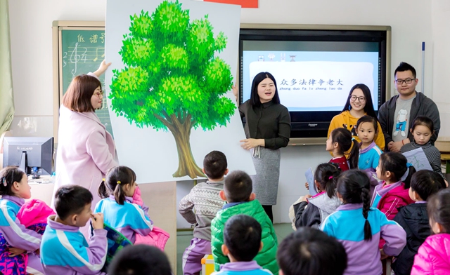 活動伊始,普法志愿者們通過生動形象的比喻向小朋友們介紹有關兩會的知識,并通過情景劇“眾多法律爭老大”來向小朋友們展示憲法、民法、刑法等法律的概念與基本內容,并讓小朋友們來評理,選出他們心中最厲害最權威的法律。小朋友們爭相說出自己的答案,答案各異,但大部分小朋友都認為憲法最厲害。當然,三位志愿者還是面對小朋友詳細的講解了為何憲法為根本大法,并且通過精心準備的道具——“法律樹”來告訴小朋友們憲法如同樹根,保護并滋養著其他法律。