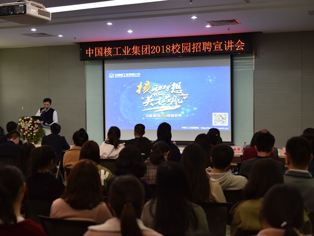 招聘會開始前,中國核工業集團在唯實報告廳舉行了招聘宣講會,介紹了集團及下屬單位的基本情況及相關招聘需求。中國核工業集團為我校2018屆畢業生提供需求崗位近2000個,涉及機械工程、光學工程、電氣工程及自動化、計算機科學與技術、軟件工程、會計學、工商管理、法學、外語等專業。