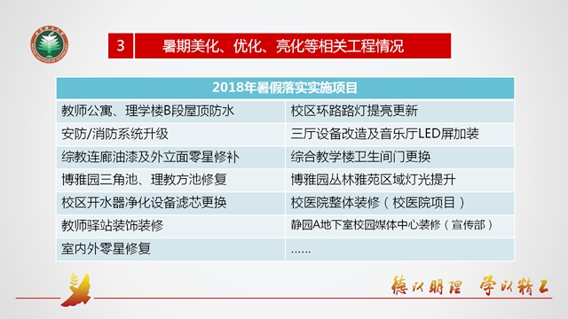 本次集中改造,主要以提升校園環(huán)境設施,增強師生員工校區(qū)學習生活的幸福感和獲得感為主旨。共計改造教師驛站9間,簡約、舒適的環(huán)境為教師課間休息、答疑提供良好的環(huán)境;更換校區(qū)環(huán)路及重點區(qū)域的路燈200余盞,提升夜間照度,增強安全出行保障,選用新型節(jié)能路燈,在節(jié)約資源同時滿足美觀;改善教學樓室內(nèi)外環(huán)境,粉刷連廊立面,增加休息討論區(qū),讓師生在整潔、舒適的環(huán)境中學習交流;修復理教方池、博雅三角池、圖書館中庭等4處水體景觀,增加靈動感;更換報告廳、演藝廳、音樂廳設施設備及基礎裝飾,增強功能性和舒適感;更新消防設施設備,安防監(jiān)控攝像頭,提高像素和分辨率,確保校區(qū)安全在握;完成水處理前置凈化端濾芯更換,確保師生飲水潔凈安全;清淤北湖小湖,恢復北湖荷花蓮花池風貌,重構(gòu)夏日荷香的景色;鋪設理教前草坪4000平米,主路樹坑草叢種植,改善環(huán)境,提升學校綠化品質(zhì);集中更換教室黑板油絲繩、破損桌椅、墻地插、照明燈及計時系統(tǒng),確保開學教學設備完好;修補破損路面、墻面、外立面,更換部分景觀燈、照明燈,檢修地下管線、供暖管線等,確保基礎設施運行安全;增設理教公共討論區(qū)、綜教連廊休息區(qū)、室外座椅,滿足不同需求;加緊天橋下社團文化廣場項目施工,為學生社團提供集中活動場所,打造北理工社團文化集散地;強化服務保障單位人員培訓和提升,接管工程實訓中心、附屬實驗學校小學教學樓,全力保障順利使用等。