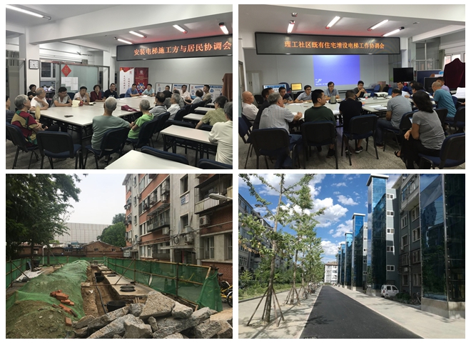 2017年8月,居管會與國資處到北航進行調研,了解電梯增設情況,9月,學校召開推進家屬區電梯試點增設專題工作推進會,逐步明確成員單位責任分工、確定實施主體。10月,居管會牽頭組織居民代表40余人到大柳樹社區、北航社區、毛紡廠社區實地參觀電梯安裝情況,并先后兩輪對符合硬性安裝條件(如樓體結構、樓層數量、消防人防等客觀條件)的居民樓進行民意調查,召開政策解答會議,累計入戶調查1800余戶。12月,工作組成員單位聯合電梯安裝實施主體、設計公司再次對家屬區住宅樓逐一進行現場勘查,確定安裝優先等級。2018年1月,居管會按照“以樓為單位,三分之二業主同意且無反對意見”的申報條件,反復數次與居民解釋、溝通、協調,最終申報增設安裝6棟樓,21個單元電梯。3月,國資處、居管會、基建處等成員單位帶領安裝電梯樓宇居民代表第三次走進北航考察,確定電梯外觀樣式。7月,電梯公司完成前期物勘、地勘和打樁定位等前期準備工作,開始進行施工。至今已完成部分樓宇的水暖改造工程,電梯加裝按計劃進行。