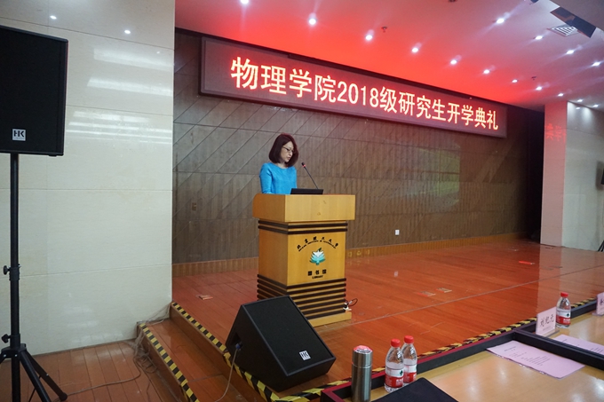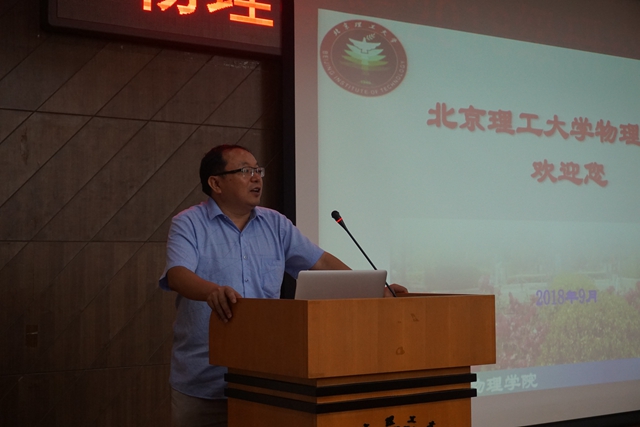 姜艷代表學院向開啟新的學習階段的2018級研究生表示祝賀和歡迎。她介紹了學校及學院的歷史沿革,講述北京理工大學如何成為中國共產黨創辦的第一所理工科學府的背景;講述70多年來幾代北理工人不忘初心、艱苦奮斗,崇德尚行、潛心治學,為抗戰建國、為國家安全和經濟建設、為中華民族偉大復興而探索和開拓的感人故事;講述物理學科作為學校最早建立的基礎學科之一,從設立之初到如今物理學院的發展脈絡。她還對同學們提出三點希望:第一,希望同學們胸懷祖國,志存高遠;第二,希望同學們潛心學問,積極創新;第三,希望同學們求真務實,恪守學術道德。鼓勵同學們迎著物理學科建設的新機遇,銘記“寧拙毋巧,寧樸毋華”的院訓,與導師們一并努力奮斗、開拓前行,為學校的“雙一流”建設貢獻自己的力量。