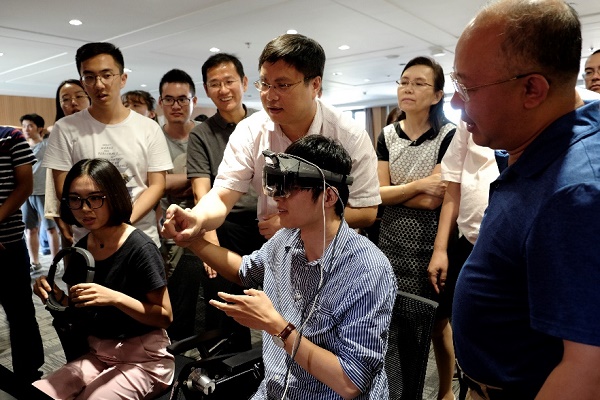 在聽取了項目負責人的匯報后,檢查組專家對項目取得的基于SLAM的穿透式頭戴無障礙呈現裝置和虛實融合環境的高效構建平臺與呈現系統等階段性成果進行了體驗與檢查。