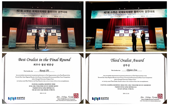 2018年11月28日至12月1日,第23屆“史丹森”國際環境法模擬法庭大賽(Stetson’s International Environmental Moot Court Competition,IEMCC)東亞賽區選拔賽(East Asia Regional Rounds,EARR)在韓國崇實大學(Soongsil University)舉行。北京理工大學法學院代表隊一路過關斬將,力克群雄,最終勇奪冠軍,并獲得了赴美國參加全球總決賽的資格。本次大賽中,石若琪同學獲得了總決賽最佳辯手(Best Oralist in the Final Round),鄒祺芊同學獲得最佳辯手第三名(Third Oralist)。