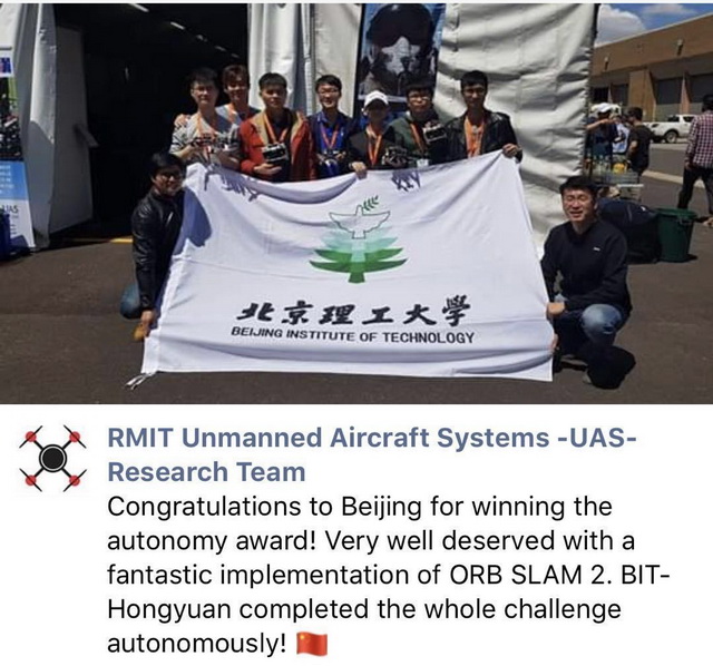 日前,2018年國際微小型無人機賽會(International Micro Air Vehicle, IMAV '2018)在在澳大利亞墨爾本舉行,北京理工大學自動化學院BIT-Hongyuan代表隊完成了室內和室外比賽,獲得了賽會室內賽自主獎(Autonomy Prize)和室外賽總分第三名。本次比賽得到了北京元六鴻遠電子科技股份有限公司大力支持。