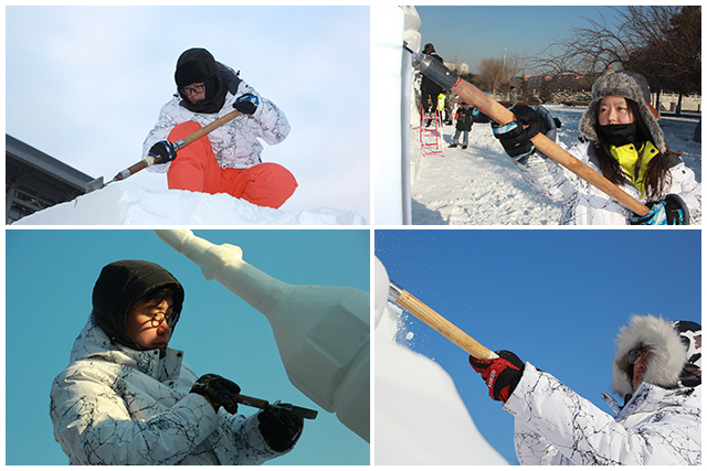 在哈爾濱零下20多度的嚴寒中,北理工雪雕隊隊員們意志堅定、不輕言放棄,克服了口罩手套結冰、戶外作業時間長、工作強度大等諸多困難,讓冰冷的雪塊逐漸煥發出火熱的生命力。