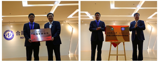 為打造“大學(xué)——中學(xué)”長(zhǎng)期合作的橋梁,兩校共建了機(jī)器人創(chuàng)新體驗(yàn)聯(lián)合實(shí)驗(yàn)室。張軍與封安保分別代表兩校共同為“北京理工大學(xué)——合肥市第一中學(xué)機(jī)器人創(chuàng)新體驗(yàn)聯(lián)合實(shí)驗(yàn)室”揭牌,并互相贈(zèng)送了北理工特色紀(jì)念品和中學(xué)生科技創(chuàng)新作品。